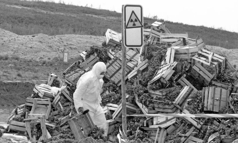 Εργαζόμενος με προστατευτική φόρμα και μάσκα ανάμεσα σε κουτιά με μολυσμένα λαχανικά στον χώρο υγειονομικής ταφής μετά από το Τσερνόμπιλ
