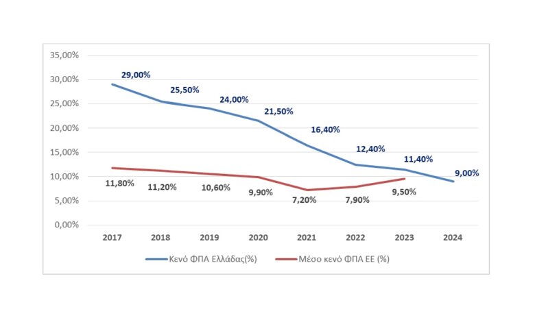 Η πτωτική τάση του κενού ΦΠΑ στην Ελλάδα συνεχίζεται, με τις προκαταρκτικές εκτιμήσεις για το 2024 να προβλέπουν περαιτέρω μείωσή του στο 9%.