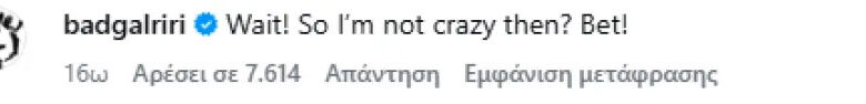 Στην ανάρτηση, η Rihanna απάντησε τη Δευτέρα 12 Ιανουαρίου: «Άρα δεν είμαι τρελή; Στοίχημα!».