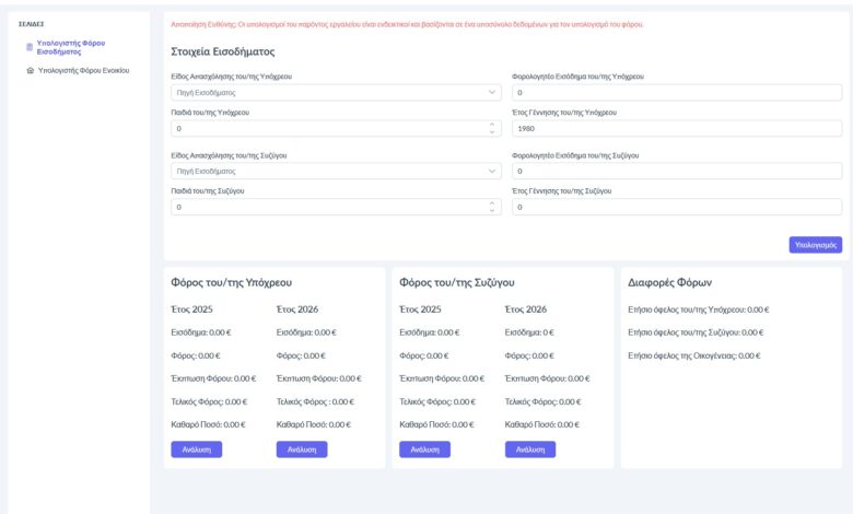 Σε ισχύ βρίσκεται από την Τρίτη (1.10.2025) η νέα ηλεκτρονική εφαρμογή, μέσω της οποίας οι φορολογούμενοι μπορούν να υπολογίσουν τα οικονομικά οφέλη που προκύπτουν από τη φορολογική μεταρρύθμιση για το Δημογραφικό και τη Μεσαία Τάξη.