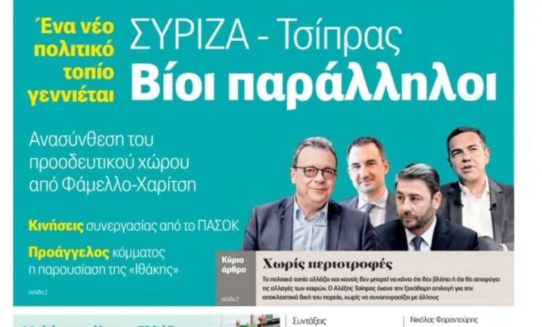 Tο πρωτοσέλιδο έχει τίτλο «ΣΥΡΙΖΑ–Τσίπρας: βίοι παράλληλοι» και σημειώνει πως ένα νέο πολιτικό τοπίο γεννιέται, αναφέρεται, δε, σε ανασύνθεση του «προοδευτικού χώρου από Φάμελλο – Χαρίτση» καθώς και σε «κινήσεις συνεργασίας από το ΠΑΣΟΚ».