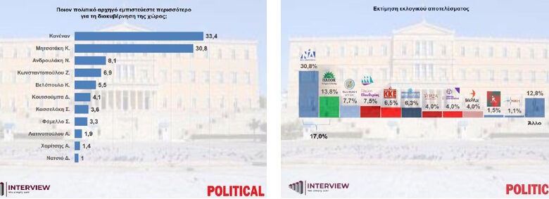 Μάλιστα, στην τελευταία δημοσκόπηση της Interview για λογαριασμό της εφημερίδας «Political», η ΝΔ φαίνεται να ξεπερνά το ψυχολογικό όριο του 30%, συγκεντρώνοντας ποσοστό 30,8%. Δεύτερο κόμμα είναι το ΠΑΣΟΚ με 17 μονάδες διαφορά και το ποσοστό να αγγίζει μόλις το 13,8%.
