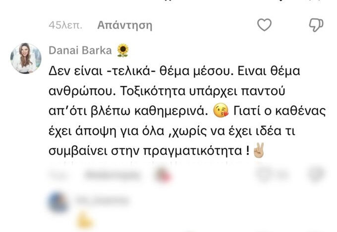 Σχολιάζοντας ένα βίντεο στο TikTok, η Δανάη Μπάρκα ανέφερε: «Δεν είναι -τελικά- θέμα μέσου. Είναι θέμα ανθρώπου. Τοξικότητα υπάρχει παντού απ’ ό,τι βλέπω καθημερινά. Γιατί ο καθένας έχει άποψη για όλα, χωρίς να έχει ιδέα τι συμβαίνει στην πραγματικότητα!».