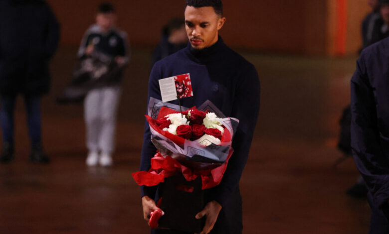 Soccer Football - UEFA Champions League - Real Madrid pay tribute to Diogo Jota - Anfield, Liverpool, Britain - November 3, 2025 Real Madrid's Trent Alexander-Arnold lays a wreath for former teammate Diogo Jota at his memorial outside Anfield Action Images via Reuters