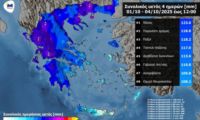 Στον παρακάτω χάρτη του meteo που ακολουθεί αποτυπώνεται η κατανομή του συνολικού αθροιστικού υετού από την περασμένη Τετάρτη έως και σήμερα, Σάββατο (04/10/25) το μεσημέρι.