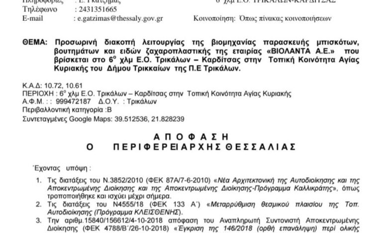 «Διακόπτουμε προσωρινά τη λειτουργία της βιομηχανίας της εταιρίας “Βιολάντα”, που βρίσκεται στο 6ο χλμ Ε.Ο Τρικάλων – Καρδίτσας στην Τοπική Κοινότητα Αγίας Κυριακής του Δήμου Τρικκαίων της Π.Ε. Τρικάλων και συγκεκριμένα του μηχανολογικού εξοπλισμού της παραγωγικής διαδικασίας (γραμμές παραγωγής και εγκαταστάσεις υγραερίου) σύμφωνα με το άρθρο 29 παρ. 1 και 2 του Ν. 3982/2011 επειδή κρίνουμε ότι προκαλείται άμεσος κίνδυνος για την ασφάλεια των εγκαταστάσεων και τον εργαζομένων σύμφωνα με τα σχετικά έγγραφα 17, 18, 19 και συγκεκριμένα απαιτείται: