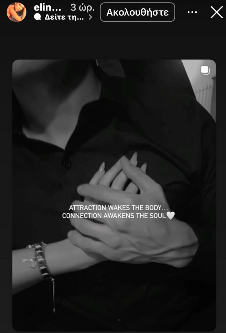 Σημειώνεται ότι τις τελευταίες ώρες, η Ελίνα Καντζά ανέβασε ένα story όλο νόημα στο Instagram, γράφοντας: «Η έλξη αποδυναμώνει το σώμα, η σύνδεση ξυπνά την ψυχή».