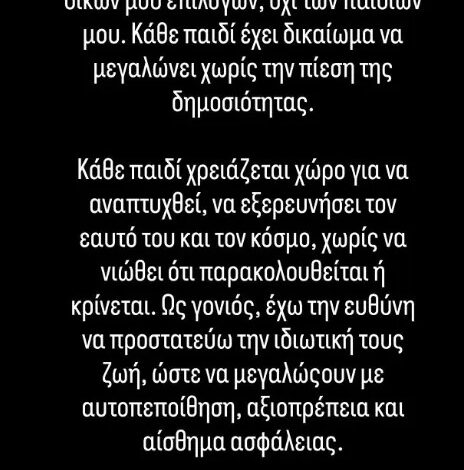 Η δημοσιότητα είναι αποτέλεσμα δικών μου επιλογών, όχι των παιδιών μου. Κάθε παιδί έχει δικαίωμα να μεγαλώνει χωρίς την πίεση της δημοσιότητας.