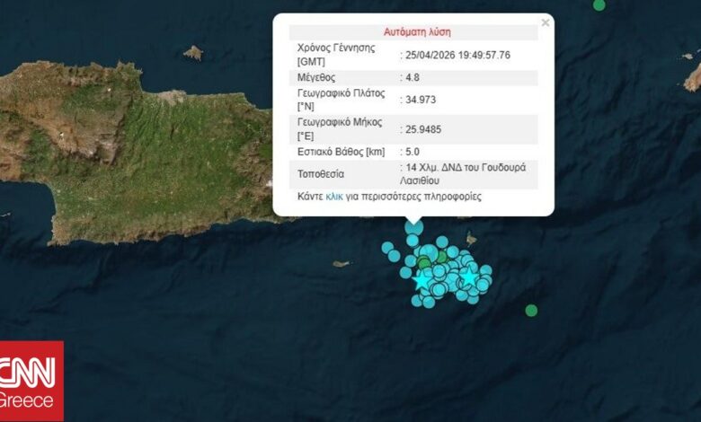 Συνεχίζεται η σεισμική δραστηριότητα στην Κρήτη, καθώς το βράδυ του Σαββάτου (25/4) σημειώθηκε σεισμός μεγέθους 4.8 Ρίχτερ στο Λασίθι.