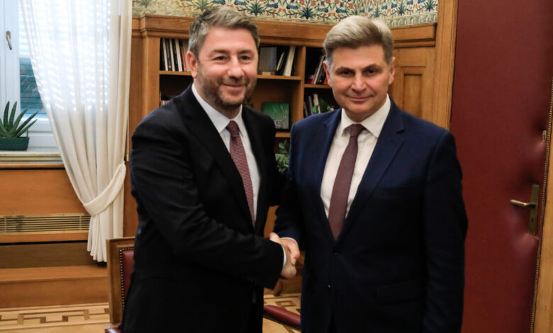 Συνάντηση του προέδρου του ΠΑΣΟΚ Νίκου Ανδρουλάκη με τον ευρωβουλευτή Νικόλα Φαραντούρη, στην Βουλή (Πηγή φωτογραφίας: ΓΙΩΡΓΟΣ ΚΟΝΤΑΡΙΝΗΣ / EUROKINISSI)