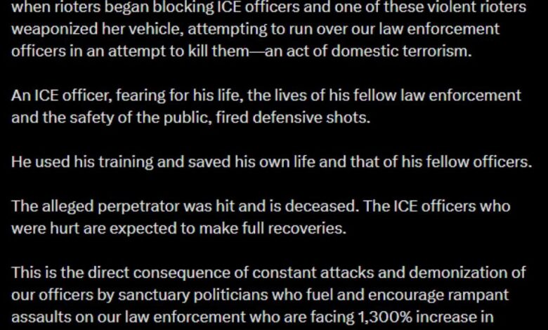Ο πράκτορας πυροβόλησε «αμυντικά για να προστατεύσει τον εαυτό του και τους ανθρώπους γύρω του», είπε, χαρακτηρίζοντας τις ενέργειες της γυναίκας «εγχώρια τρομοκρατία» και δηλώνοντας ότι πάνω από 2.000 πράκτορες έχουν αναπτυχθεί στην πόλη.