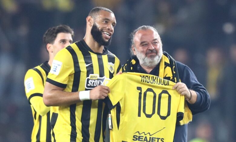 Ο Αρόλντ Μουκουντί συμπλήρωσε κόντρα στον Ατρόμητο, 100 συμμετοχές με τη φανέλα της ΑΕΚ και ο ιδιοκτήτης της “κιτρινόμαυρης” ΠΑΕ, Μάριος Ηλιόπουλος κατέβηκε στον αγωνιστικό χώρο για να τον συγχαρεί.