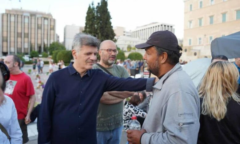 Ο Πάνος Ρούτσι σε συζήτηση με καλλιτέχνες έξω από τη Βουλή