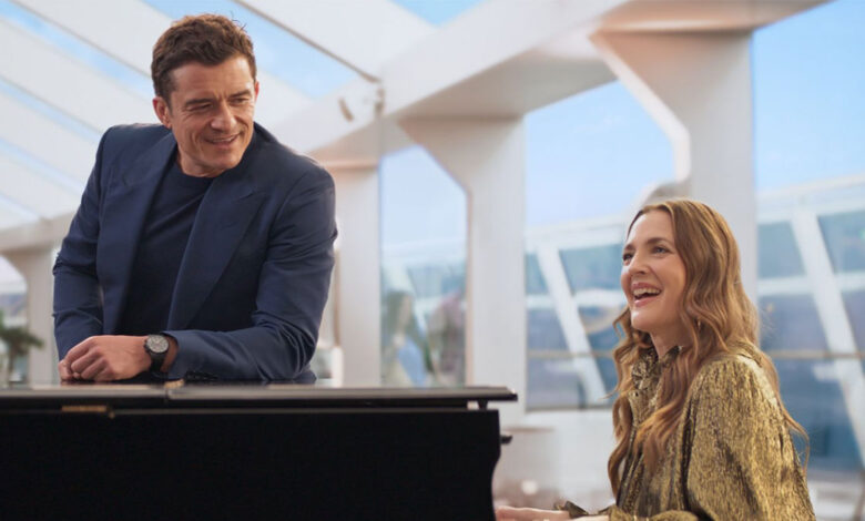 Η σκηνή έχει γυριστεί στο πλαίσιο της καμπάνιας «Let’s Holiday», που αναδεικνύει το εύρος εμπειριών που μπορεί να ζήσει ένας ταξιδιώτης στο MSC World America. Η Drew Barrymore και ο Orlando Bloom εμφανίζονται καθισμένοι σε τραπέζι, ενώ γύρω τους επικρατεί γιορτινή ατμόσφαιρα.