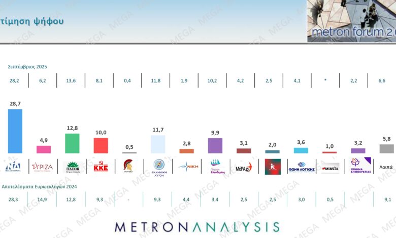 Σύμφωνα με την δημοσκόπηση της Metron Analysis που παρουσιάστηκε στο κεντρικό δελτίο ειδήσεων του Mega η Νέα Δημοκρατία στην εκτίμηση ψήφου συγκεντρώνει 28,7% έναντι του ΠΑΣΟΚ που ακολουθεί με 12,8%.