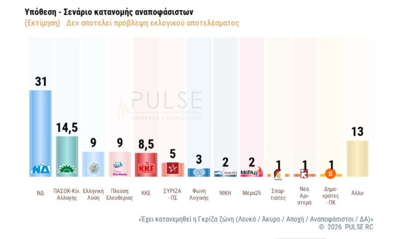Η Νέα Δημοκρατία συνεχίζει να διατηρεί ξεκάθαρο προβάδισμα 16,5 μονάδων έναντι του ΠΑΣΟΚ σύμφωνα με την δημοσκόπηση της Pulse.