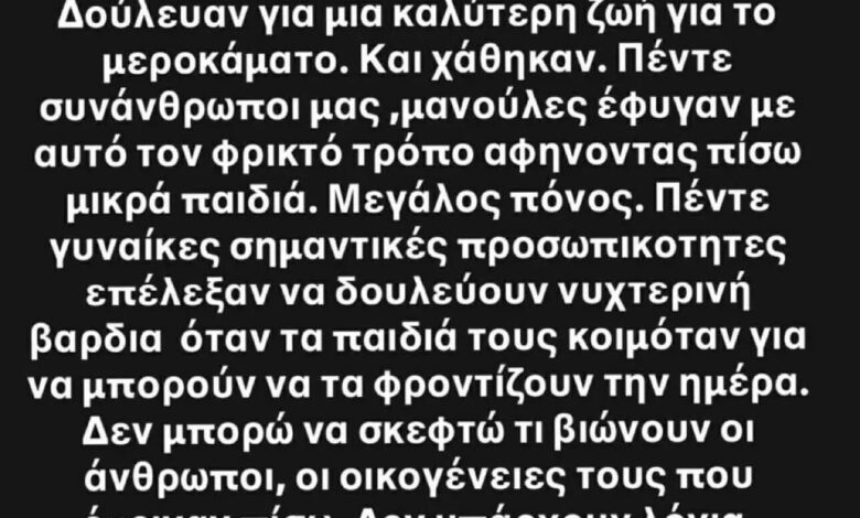Η Ρούλα Κορομηλά έστειλε ένα συγκλονιστικό μήνυμα μέσω Instagram για την έκρηξη στο εργοστάσιο της Βιολάντα, που στοίχισε τη ζωή σε πέντε γυναίκες.