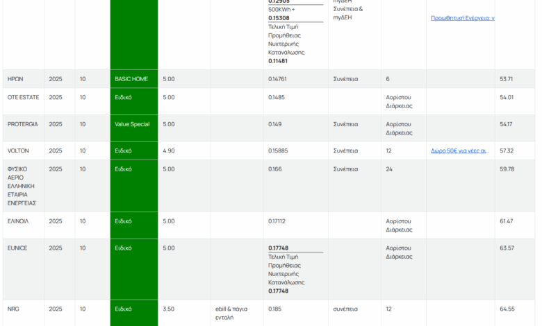 Ανάμεικτες τάσεις παρατηρήθηκαν στα πράσινα τιμολόγια ηλεκτρικού ρεύματος για τον Οκτώβριο 2025.
