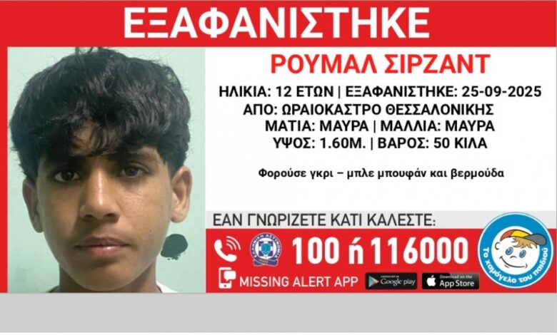 Πρόκειται για τον Σιρζάντ Ρουμάλ 12 ετών αφγανικής καταγωγής ο οποίος εξαφανίστηκε στις 25/09/25, στις 16:45 το απόγευμα, από χώρο φιλοξενίας στη περιοχή του Ωραιοκάστρου Θεσσαλονίκης.