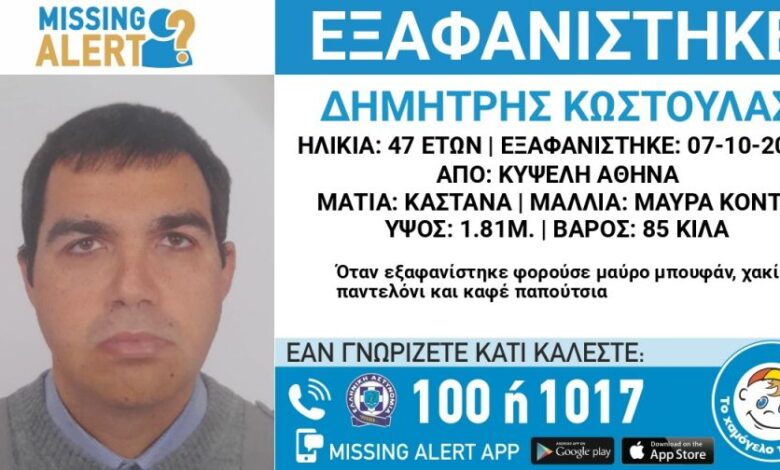Στις 7/10/2025 εξαφανίστηκε από την περιοχή της Κυψέλης ο Κωστούλας Δημήτρης, 47ετών.