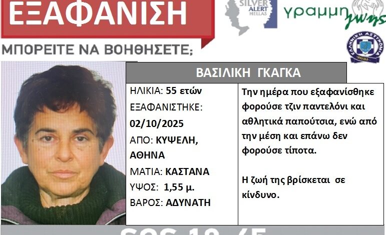 Σύμφωνα με την γραμμή ζωής πρόκειται για την Βασιλική Γκάγκα, 55 ετών, η οποία εξαφανίστηκε στην περιοχή της Κυψέλης, στην Αθήνα, το βράδυ της 02/10/25.