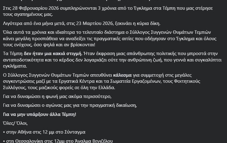 «Στις 28 Φεβρουαρίου 2026 συμπληρώνονται 3 χρόνια από το Έγκλημα στα Τέμπη που μας στέρησε τους αγαπημένους μας.