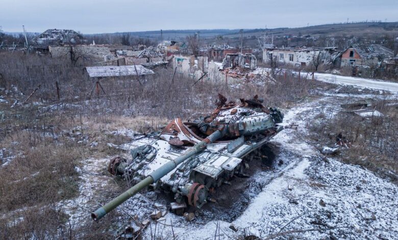 Ένα κατεστραμμένο ρωσικό τανκ καλυμμένο από χιόνι στέκεται στο χωριό Καμιάνκα, στην περιοχή του Χάρκοβο, στην Ουκρανία, το Σάββατο 14 Ιανουαρίου 2023.
