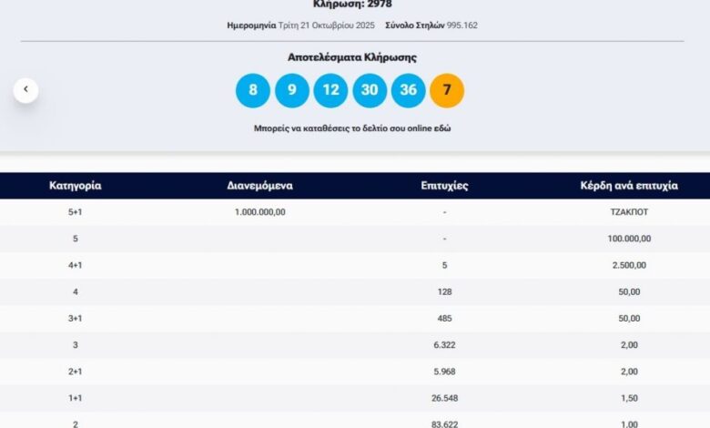 Οι τυχεροί αριθμοί της κλήρωσης είναι οι εξής: 8, 9, 12, 30, 36 και Τζόκερ ο αριθμός 7.
