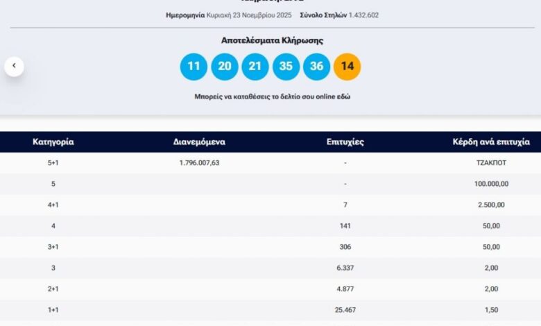 Οι τυχεροί αριθμοί της κλήρωσης είναι οι εξής: 11, 20, 21, 35, 36 και Τζόκερ ο αριθμός 14.
