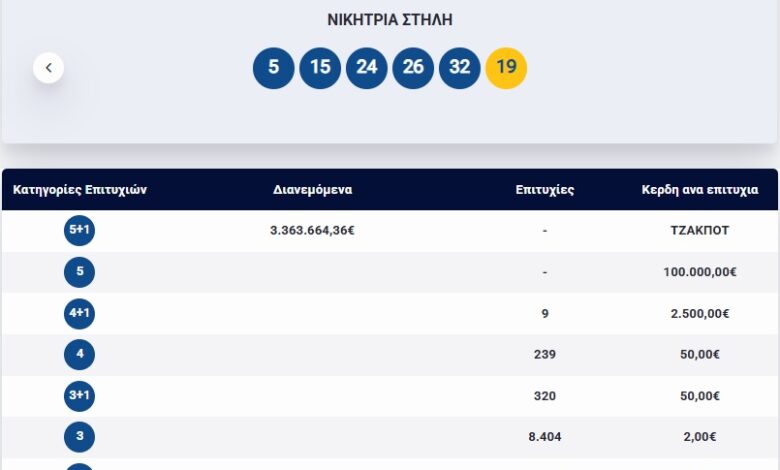 Οι τυχεροί αριθμοί που ανέδειξε η αποψινή κληρωτίδα είναι οι: 5, 15, 24, 26, 32 και αριθμός Τζόκερ το 19.