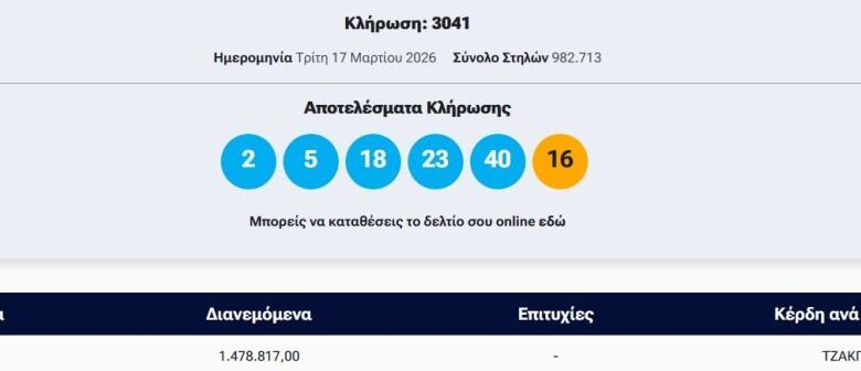 Πραγματοποιήθηκε το βράδυ της Τρίτης (17/3) η κλήρωση 3041 του Τζόκερ που μοιράζει στην πρώτη κατηγορία 1.478.817 ευρώ.