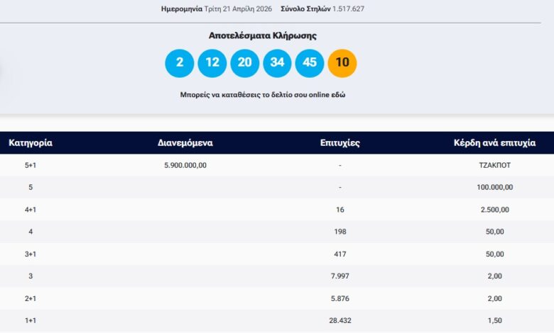 Πραγματοποιήθηκε το βράδυ της Τρίτης (21/4) η κλήρωση 3056 του Τζόκερ που μοιράζει στην πρώτη κατηγορία πάνω από 5.900.000 εκατ. ευρώ.