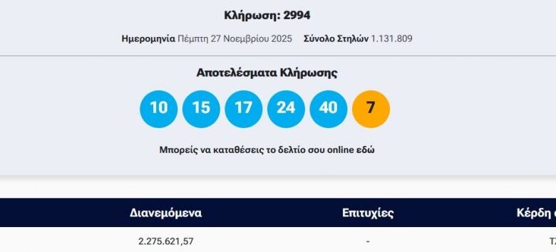 Πραγματοποιήθηκε το βράδυ της Πέμπτης (27/11) η κλήρωση 2994 του Τζόκερ που μοιράζει στην πρώτη κατηγορία πάνω από 2,2 εκατομμύριο ευρώ.