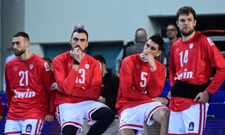 Οι παίκτες του Ολυμπιακού απογοητευμένοι μετά την ήττα από τον Παναθηναϊκό/ (KLODIAN LATO / EUROKINISSI)