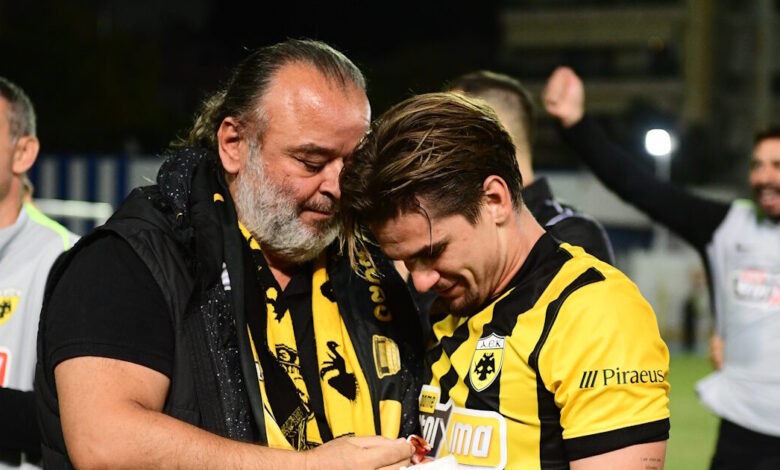 Μετά τη λήξη του αγώνα, ο Μάριος Ηλιόπουλος κατέβηκε στον αγωνιστικό χώρο για να χαιρετήσει και αγκαλιάσει τους παίκτες και ειδικά τους δύο μεγάλους πρωταγωνιστές της νίκης της ΑΕΚ, Λούκα Γιόβιτς και τον Ραζβάν Μάριν.