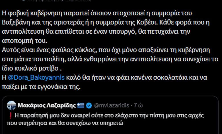 «Η φοβική κυβέρνηση παραιτεί όποιον στοχοποιεί η συμμορία του Βαξεβάνη και της αριστεράς ή η συμμορία της Κοβέσι. Κάθε φορά που η αντιπολίτευση θα επιτίθεται σε έναν υπουργό, θα πετυχαίνει την αποπομπή του. Αυτός είναι ένας φαύλος κύκλος, που όχι μόνο απαξιώνει τη κυβέρνηση στα μάτια του πολίτη, αλλά ενθαρρύνει την αντιπολίτευση να συνεχίσει το ίδιο κυκλικό μοτίβο. Η Ντόρα Μπακογιάννη καλό θα ήταν να φάει κανένα σοκολατάκι και να παίξει με τα εγγονάκια της», αναφέρεται στην ανάρτηση που αναδημοσίευσε ο Μακάριος Λαζαρίδης.