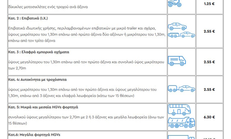 Κατηγορία 6Μεγάλα φορτηγά (HGVs). Συνολικού ύψους μεγαλύτερου των 2,70 μ. με 4 άξονες ή περισσότερους: 10,10 ευρώ.