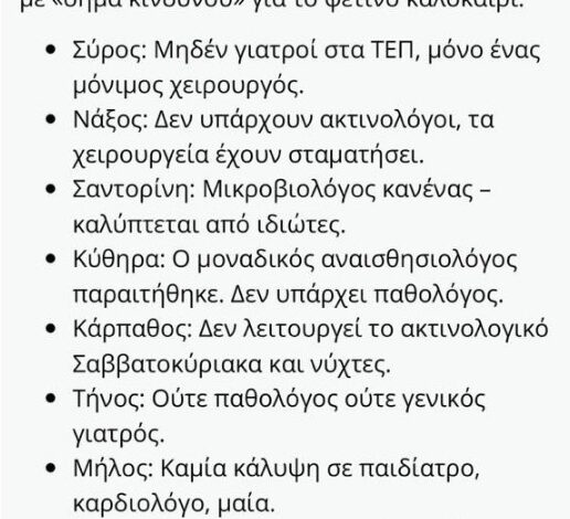 Στην Τήνο παθολόγος γενικός δεν υπάρχει μεν, υπάρχουν όμως 3 ειδικευμένοι γιατροί, αναμένεται και η τοποθέτηση ακτινολόγου από την τελευταία προκήρυξη, καθώς και 10 αγροτικοί.