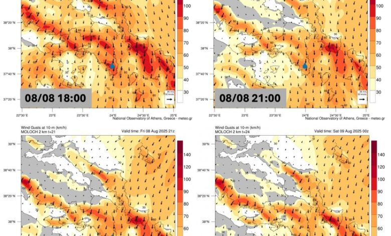 Όπως φαίνεται και στα διαγράμματα, οι ριπές των ανέμων κατά τη διάρκεια της ημέρας, αλλά και μέχρι τις πρώτες πρωινές ώρες του Σαββάτου, φθάνουν τα 90 χιλιόμετρα την ώρα.