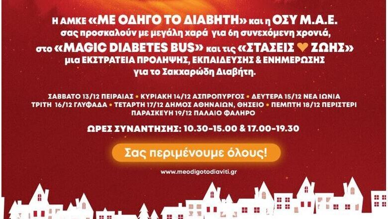 Το Magic Diabetes Bus της ΑΜΚΕ «Με Οδηγό το Διαβήτη», σε συνεργασία με την ΟΣΥ και την πρωτοβουλία «Στάσεις Ζωής, βγαίνει για 6η χρονιά στους δρόμους και στις πλατείες της Αθήνας από τις 13 έως τις 19 Δεκεμβρίου, για να ευαισθητοποιήσει, να ενημερώσει για τον διαβήτη και τον εμβολιασμό και να σκορπίσει χριστουγεννιάτικη μαγεία σε όλη την Αττική.