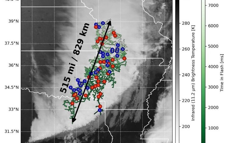 Η «μεγα-αστραπή» διέσχισε 829 χιλιόμετρα από το ανατολικό Τέξας μέχρι το Μιζούρι, σκεπάζοντας επίσης την Οκλαχόμα, το Αρκάνσας, και το Κάνσας σε επτά δευτερόλεπτα, και ξεπερνώντας το προηγούμενο ρεκόρ των 768 χλμ., αναφέρει το LiveScience.