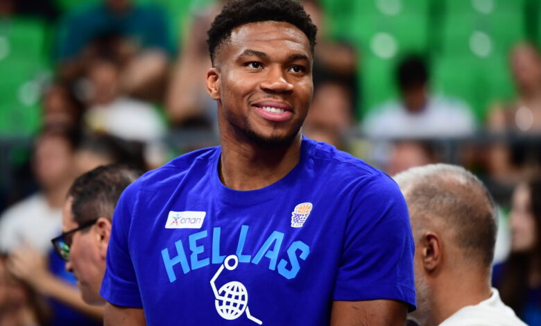 O Γιάννης Αντετοκούνμπο παρακολουθεί χαμογελαστός από τον πάγκο το Ελλάδα – Βέλγιο