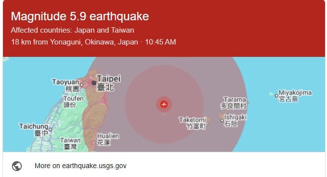 Σεισμός μεγέθους 5,9 βαθμών της κλίμακας Ρίχτερ σημειώθηκε κοντά στη βορειοανατολική ακτή της Ταϊβάν, σύμφωνα με τα στοιχεία που παρείχε το Ευρωπαϊκό-Μεσογειακό Σεισμολογικό Κέντρο (EMSC).