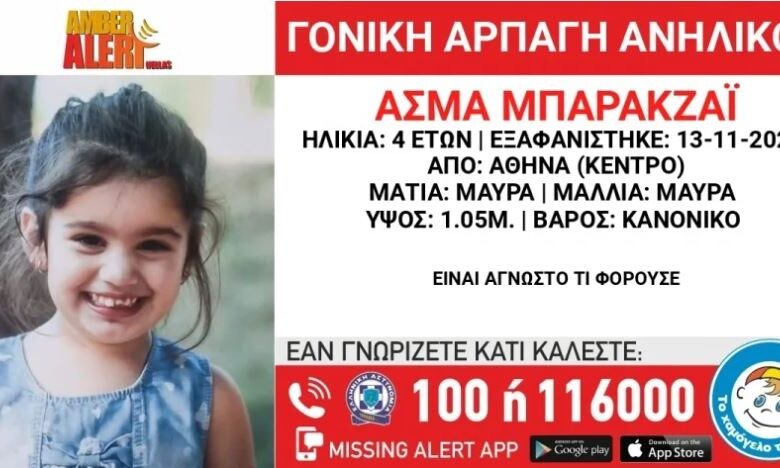 «Το Χαμόγελο του Παιδιού» ενημερώθηκε σήμερα 7/2/25 και προχώρησε άμεσα στην ενεργοποίηση του μηχανισμού AMBER ALERT HELLAS κατόπιν εισαγγελικής εντολής. Η Μπαρακζάι (επ.) Άσμα (ον.) έχει μαύρα μαλλιά, μαύρα μάτια, κανονικό βάρος και ύψος. Είναι άγνωστο τι φορούσε όταν εξαφανίστηκε.