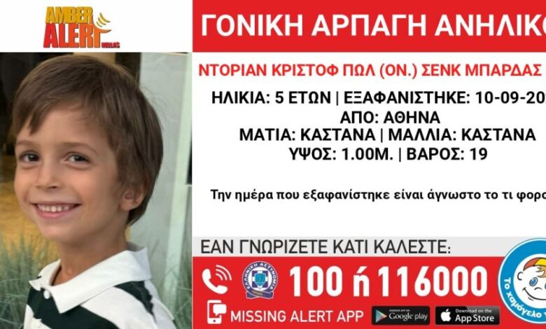 «Στις 10/09/2025 η μητέρα προέβη σε αρπαγή του ανήλικου Μπάρδα Σενκ (επ.) Ντόριαν Κρίστοφ Πωλ (ον.), 5 ετών, από την περιοχή της Αθήνας και έκτοτε αγνοούνται.