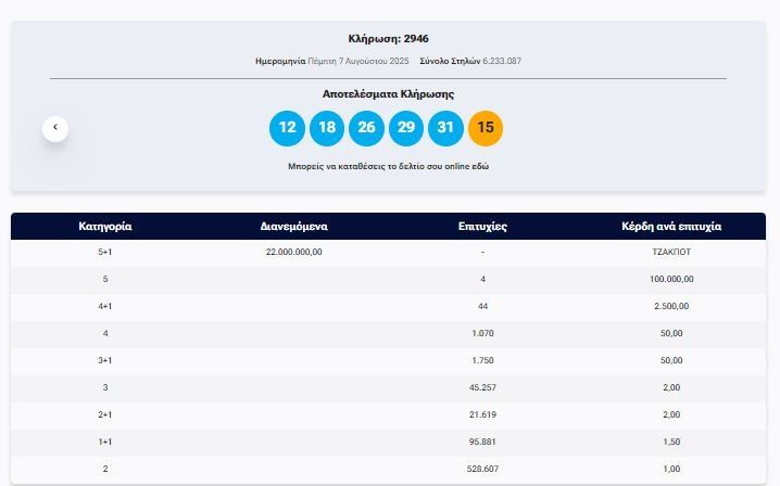 12, 18, 26, 29, 31 και αριθμός Τζόκερ το 15.