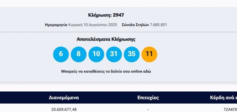 Πραγματοποιήθηκε το βράδυ της Κυριακής 10 Αυγούστου η κλήρωση 2947 του Τζοκερ που μοιράζει στην πρώτη κατηγορία περισσότερα από 23,5 εκατ. ευρώ .